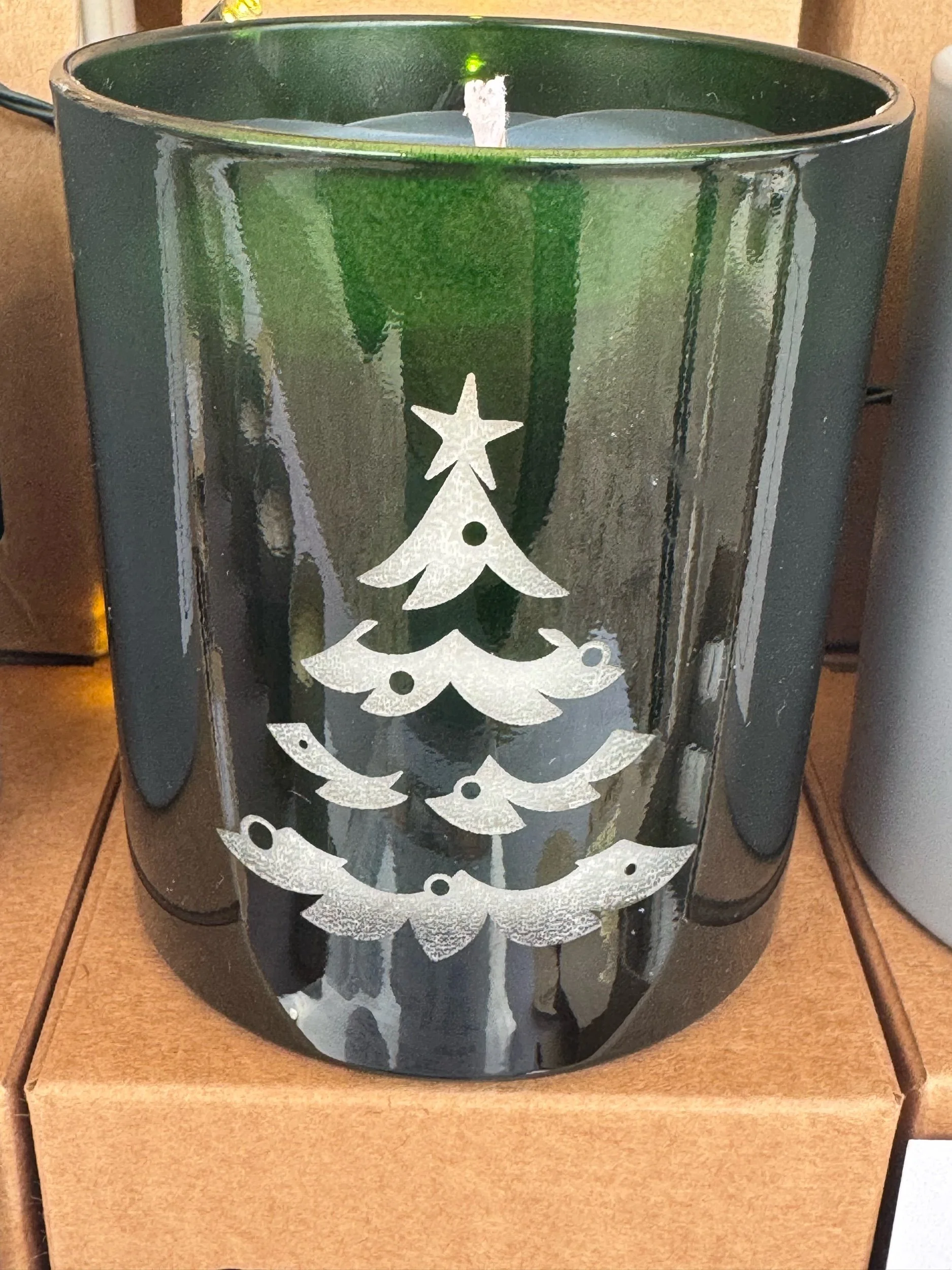 Our best selling Lapland Pines candle gets all dressed up in a new limited edition emerald green tree vase. As the candle burns the tree glows with the gentle flicker of candle light.